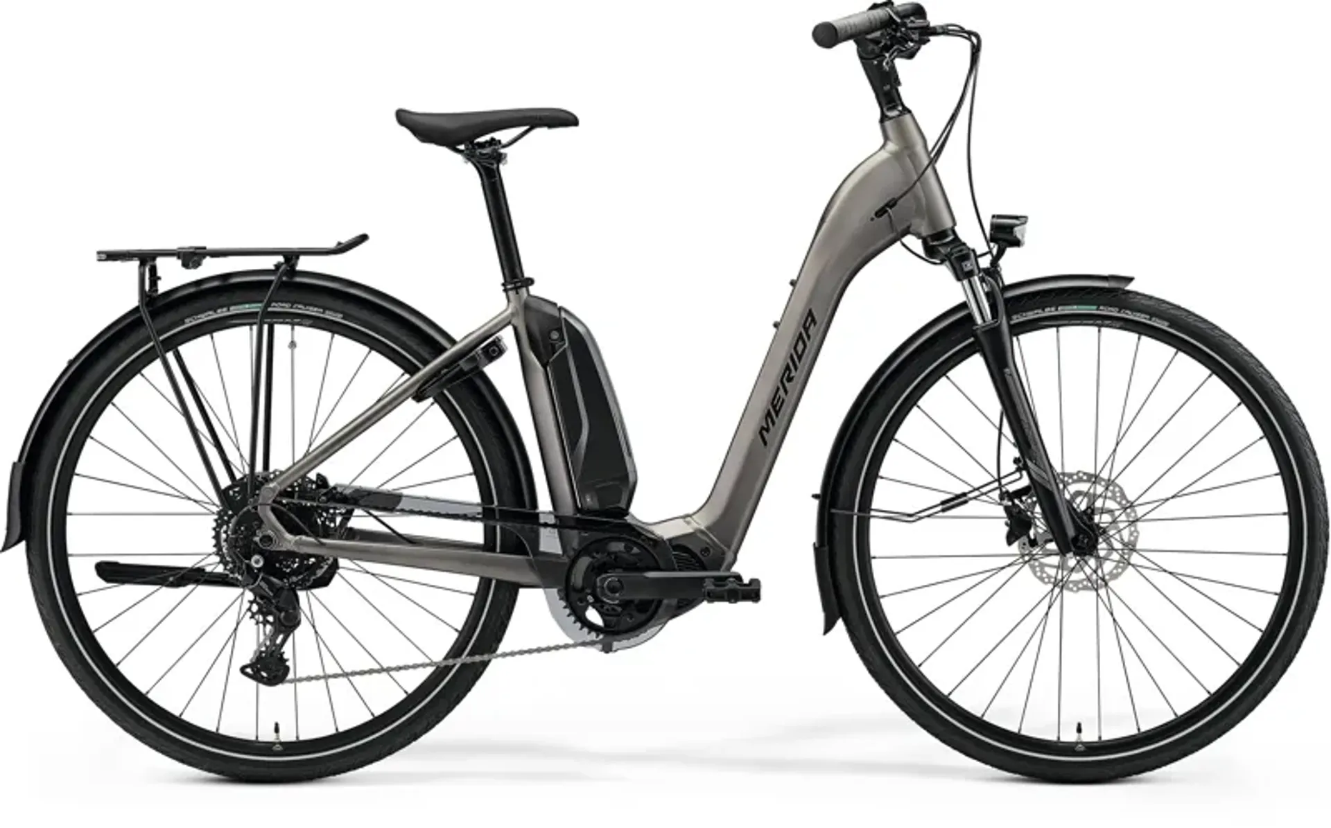 Merida's affordable entry into the eSPRESSO CITY family. A strong Shimano drive unit with 418 Wh external battery in their low step-through frame, plus it's fully equipped with fenders, lights, lock, rack and fast-rolling tyres.