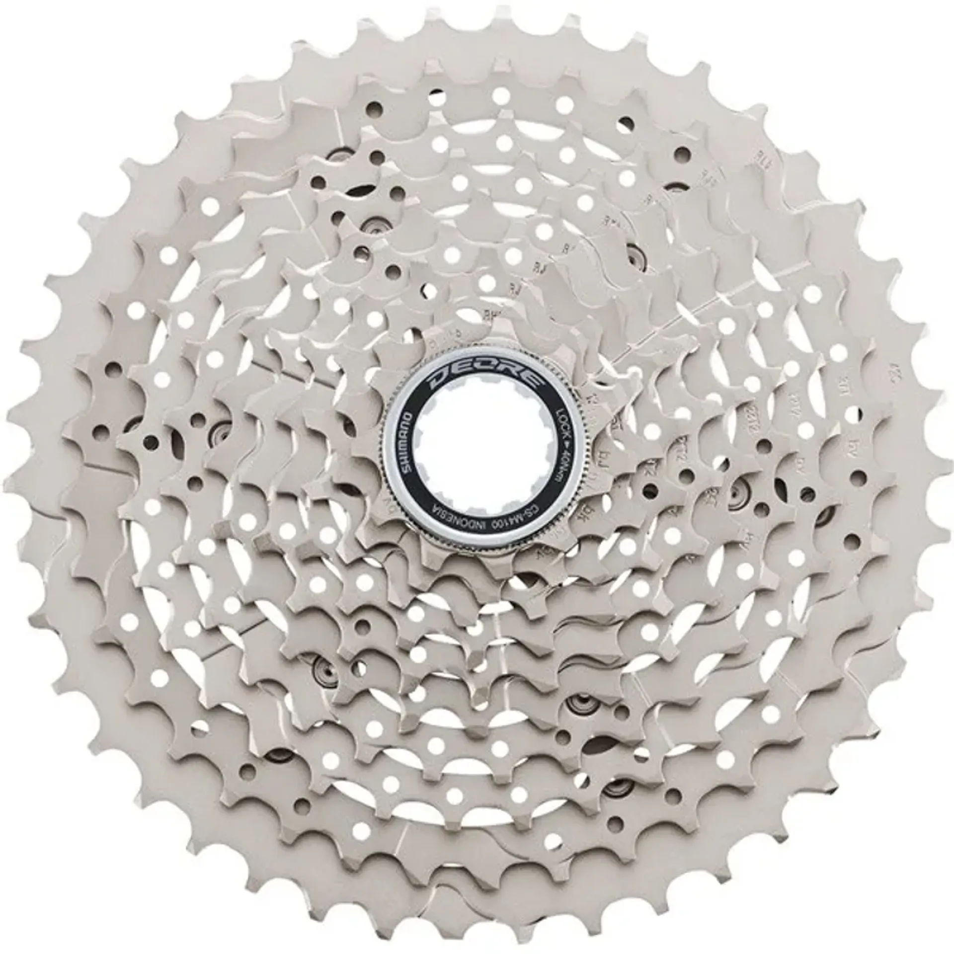 Deore m4100 10-speed dyna-sys cassette featuring light weight minimal design sprocket carrier.