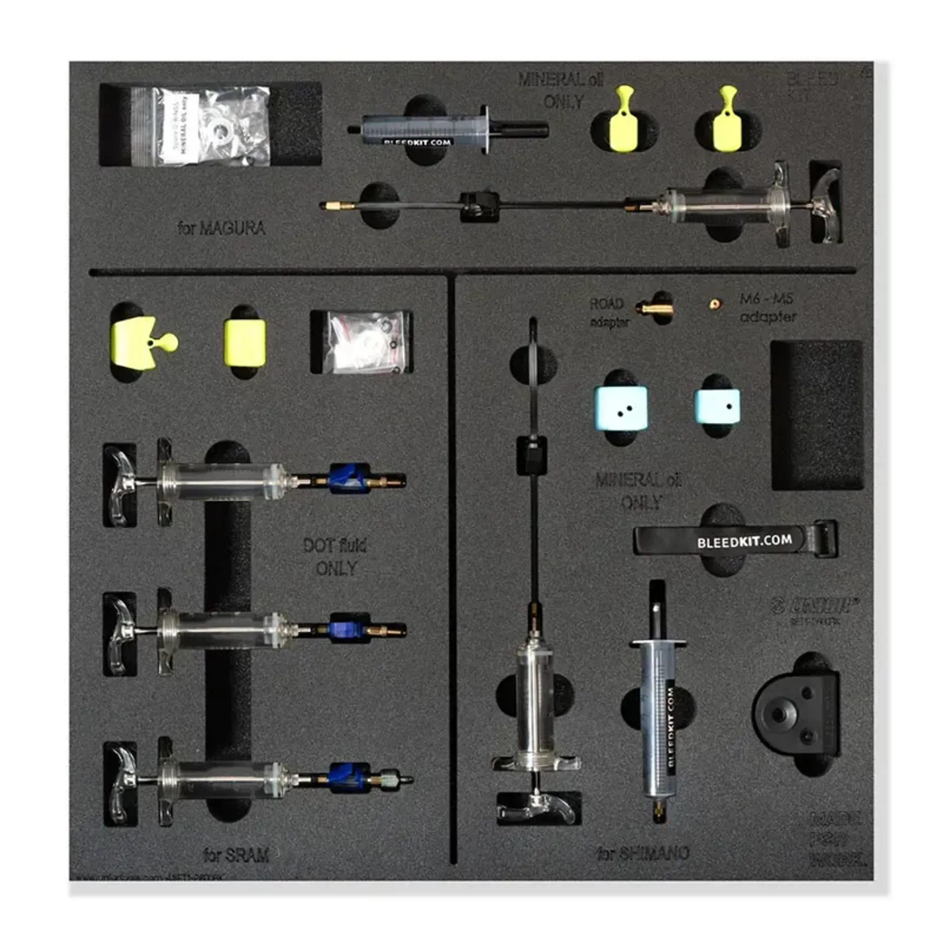 The tray includes complete set for bleeding most popular brakes on the market.